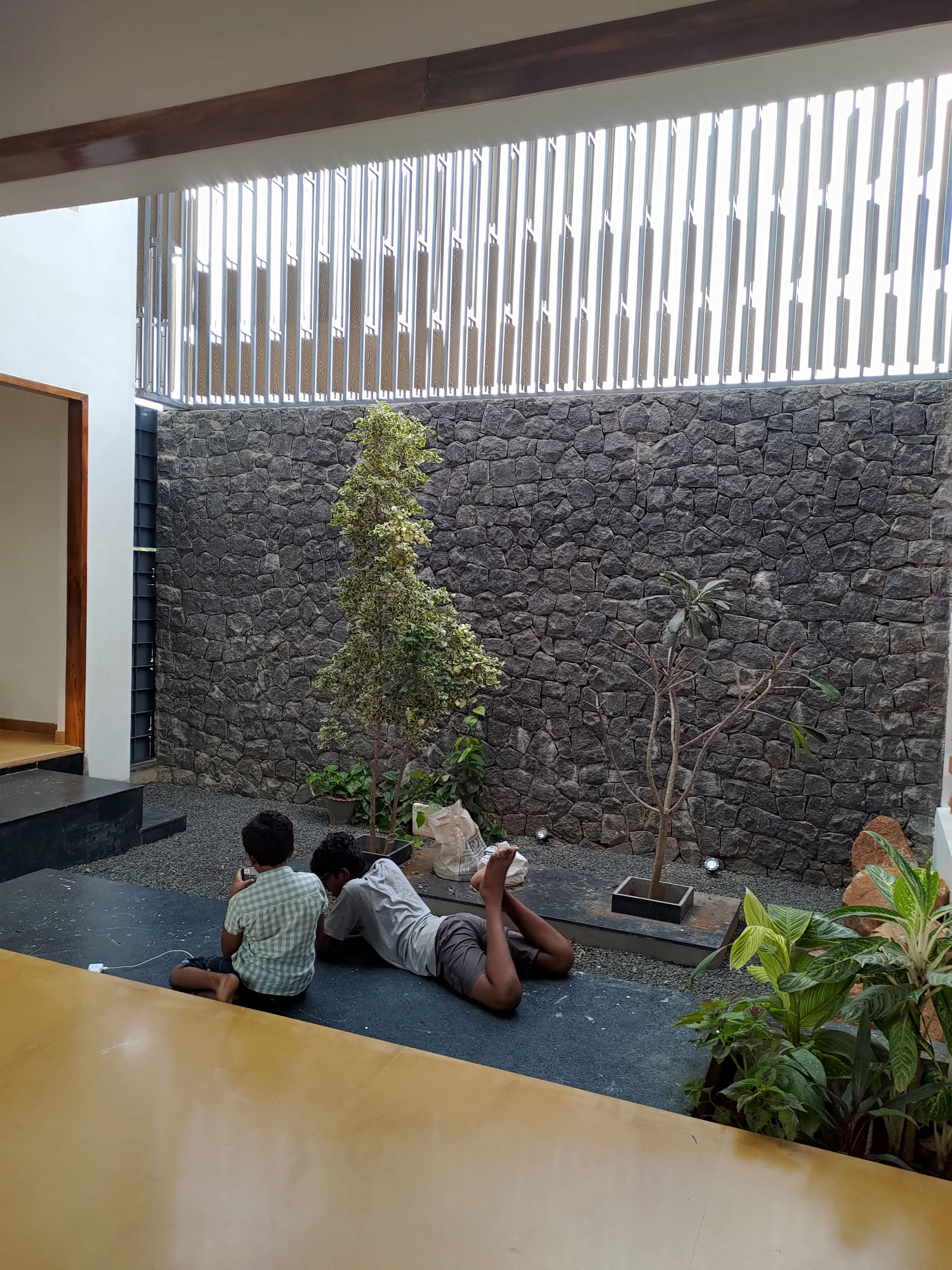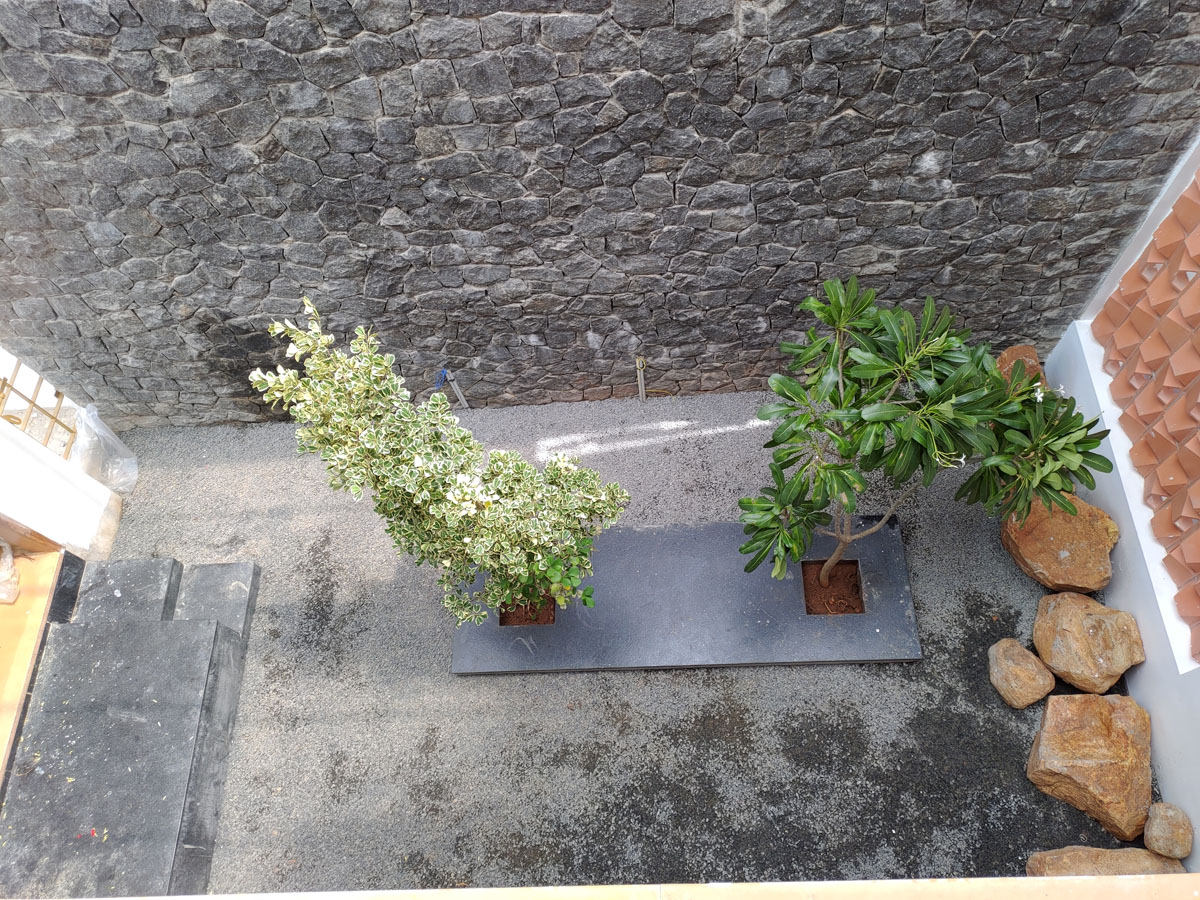 Rocks from the Courtyard: Unique approach of preserving rocks found during excavation, integrating them into the courtyard's design from foundation to finishing, adding a natural, grounded feel to the space.