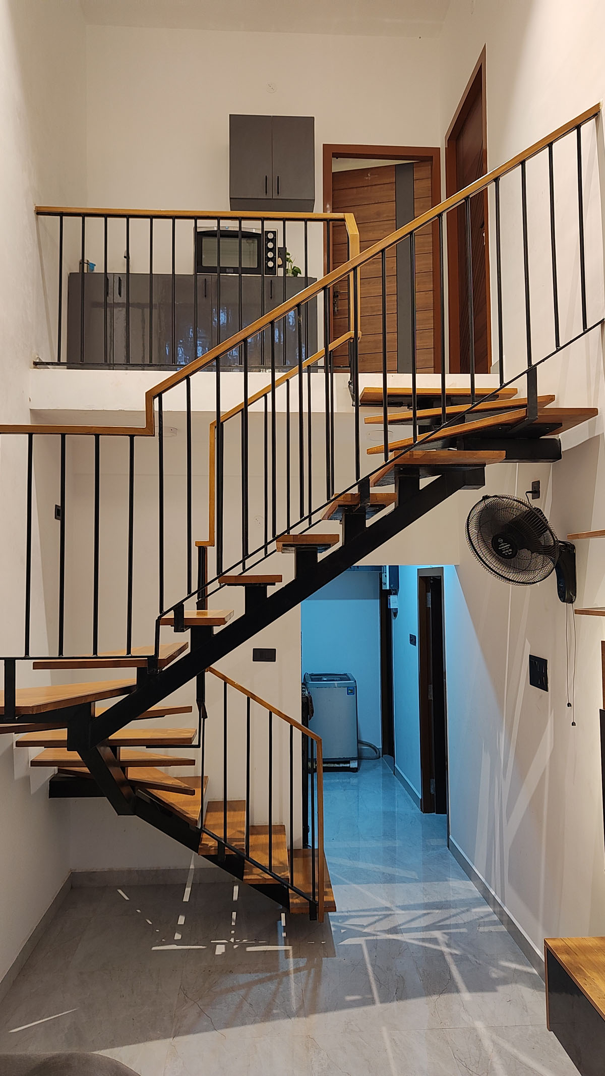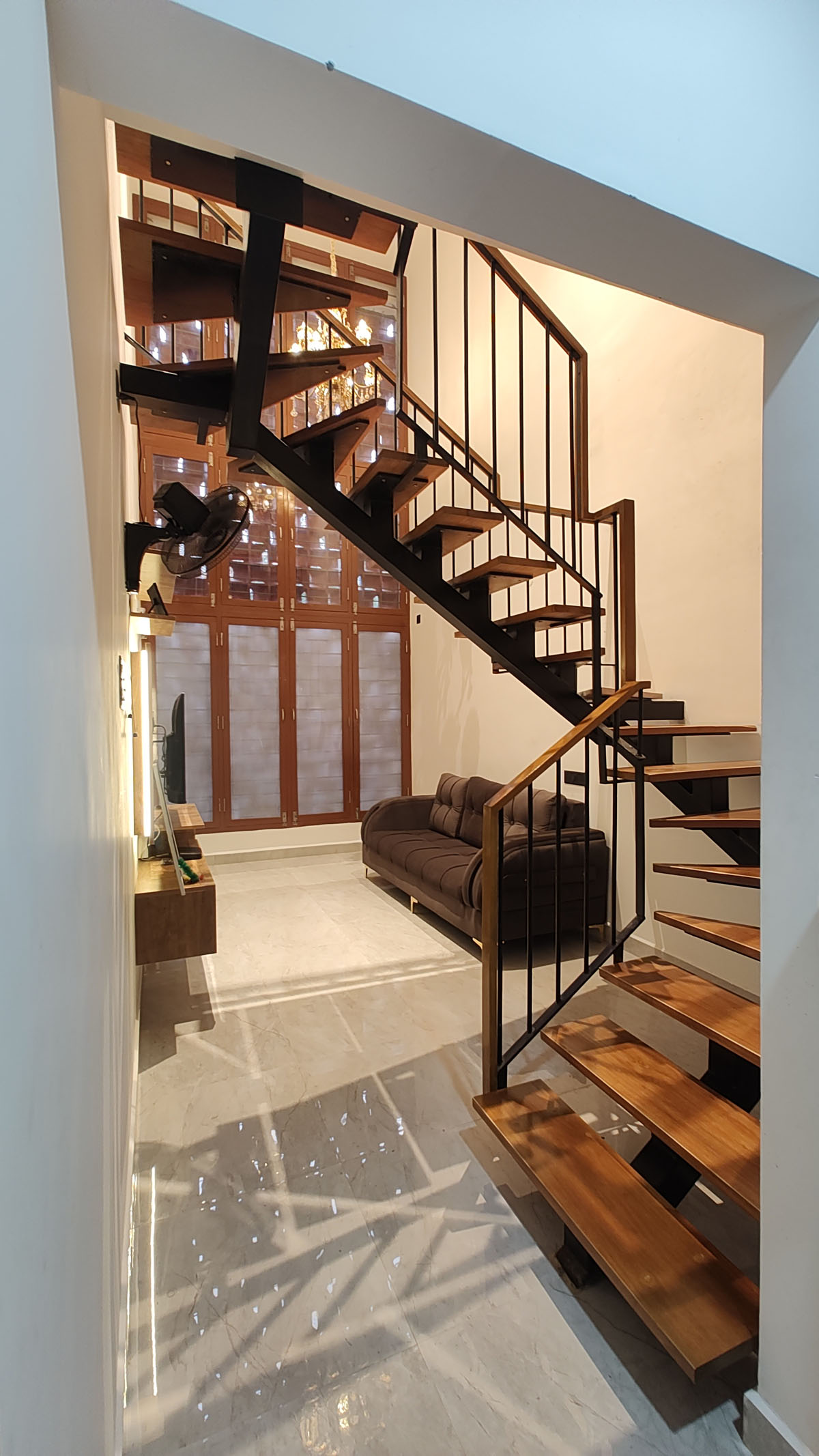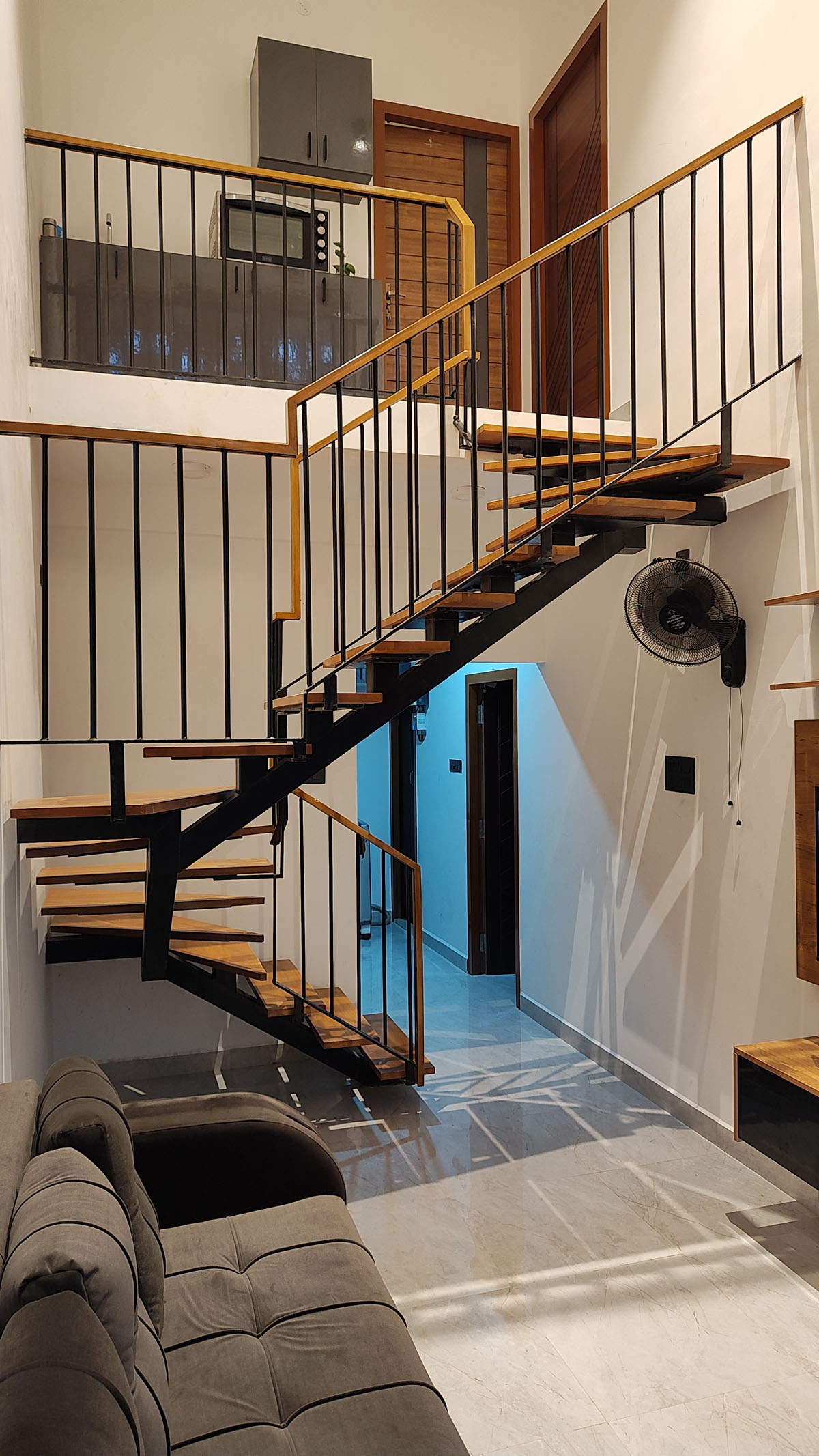 Double Height Living Space: A signature feature of this project is the double-height living area. This architectural choice not only enhances the aesthetic appeal but also provides a spacious feel, making the compact area seem more expansive.