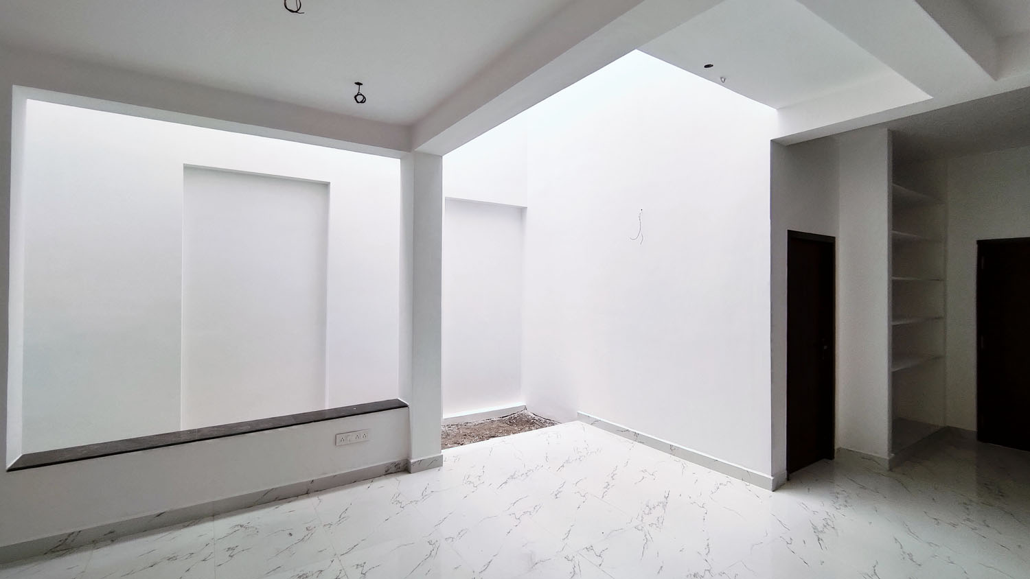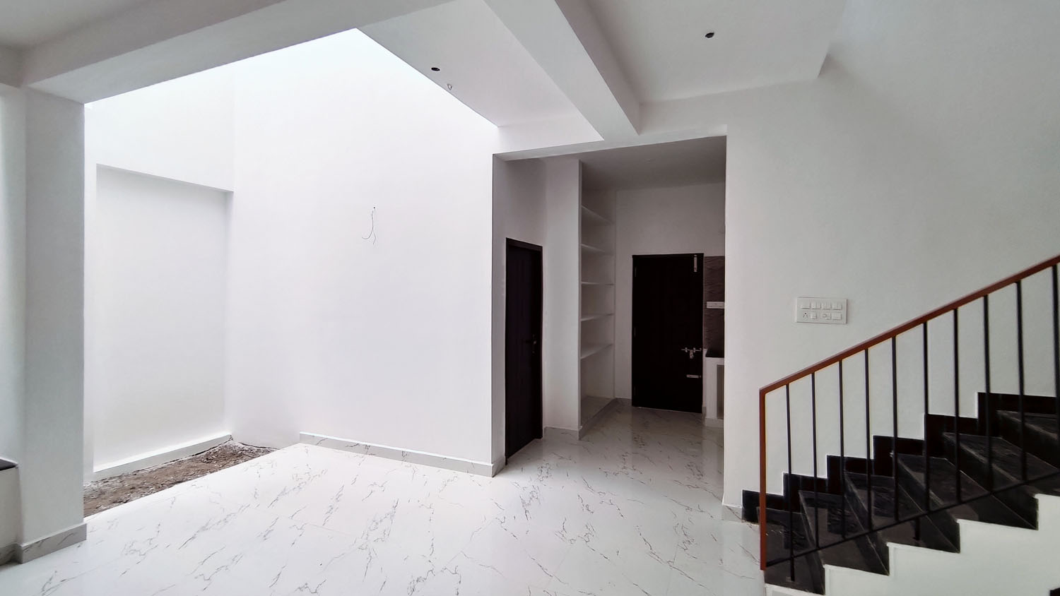 West-Facing Plot: To address the challenges of a west-facing plot, the fenestration on the west side is kept minimal, effectively restricting harsh sun rays from entering the residence.